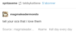 rulesinsanity Uncategorized November 26, 2016December 8, 2018 1 Minute For Atumu, actions speak a lot louder than words. And he is usually pretty hesitant about the responsibilities required to be the recipient of love. He says he loves you too. bucketofchum: I tried to relay the message @syntaxeme Share this: Share on X (Opens in new window) X Share on Facebook (Opens in new window) Facebook Like Loading... Related Published by rulesinsanity View all posts by rulesinsanity Published November 26, 2016December 8, 2018