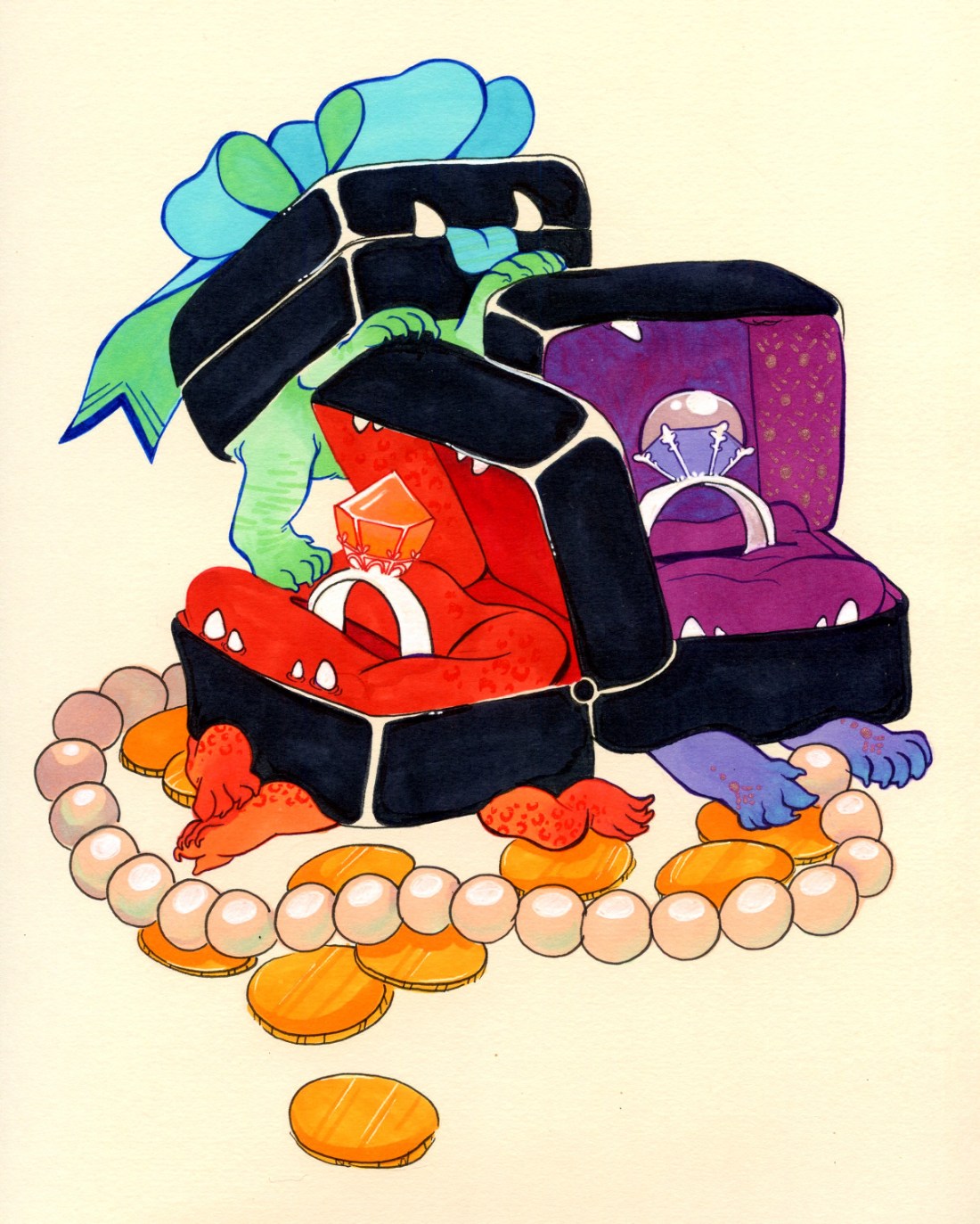 inktober day18: a litter of mimics born in the local high-class jewelry shop. that’s what they get for letting the neighbor’s curio cabinet sniff around their guard display case.