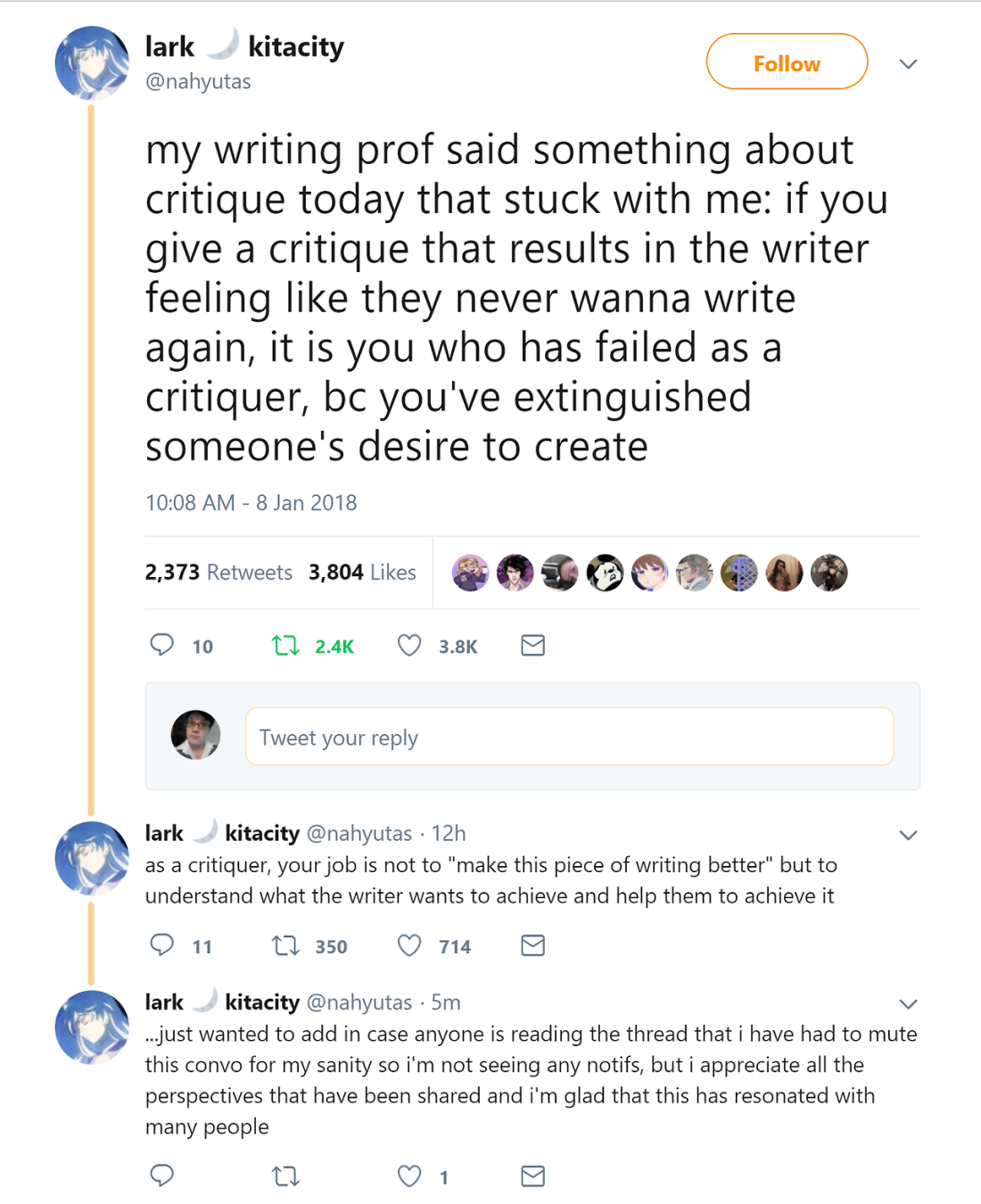 As a critiquer, your job is not to “make this piece of writing better” but to understand what the writer wants to achieve and help them to achieve it