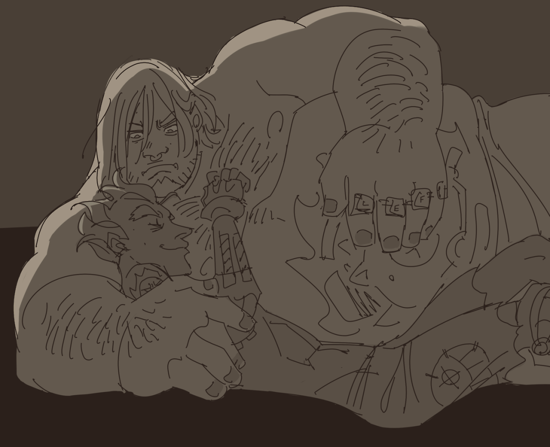- or he will contemplate on just rolling over onto him and crush him so he can sleep and muffle junkrat's shrill voice