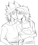 "More,“ he whispered as he let go once more to seat himself upright again. This time his hands were tugging at the other’s pants. The belt meant nothing to him as he bypassed it and ripped the yami’s trousers down to his knees. The undergarment soon was yanked down as well. As for himself, Malik had no problem getting his own pants down and there was a surprising lack of undergarment for himself not that Marik had time to notice this.
