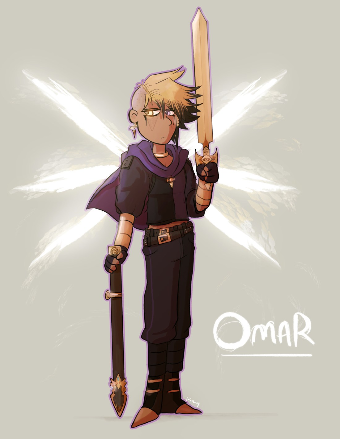 His weapon is a Sword AND a Scabbard. The Rod itself has a sheath to hide the sharp end. But for this fusion, the Scabbard is to symbolize the protectiveness of Odion, and the Sword for Marik’s strength. This fusion also has a Light theme: He makes traps and can make them invisible, as well as create small illusions. He stands for Justice, but that can lead to an extreme whenever for good or bad. He can make wings made of light and fly.